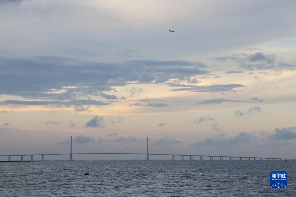 一架飛機飛過上海長江大橋上空(2023年7月26日攝)