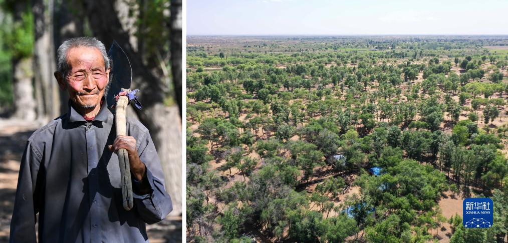 這是一張拼版照片。左圖為內蒙古鄂托克前旗呼和陶勒蓋嘎查的牧民曹扎娃出門勞作(6月14日攝);右圖為曹扎娃的承包地(6月14日攝,無人機照片)。20世紀80年代,在毛烏素沙地中,曹扎娃主動承包了2300多畝沙地。這么多年來,曹扎娃堅持種樹治沙,最終將沙地變成了林海。