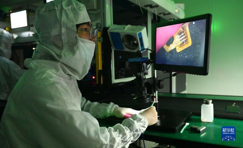 8月14日,在贛州市同興達科技有限公司(金鳳梅園廠區),工作人員在用顯微鏡檢驗產品是否存在焊接不良。