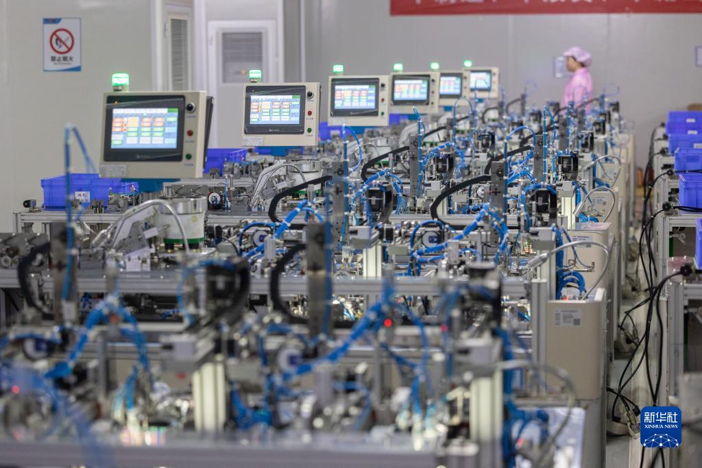 8月14日,在贛州訊康電子科技有限公司,工作人員從T1-T2全自動穿環機旁走過,該機器生產磁性元器件。