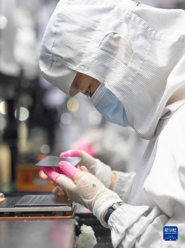 8月14日,在贛州市同興達科技有限公司(金鳳梅園廠區),工作人員觀察一款手機屏幕的蓋板玻璃。