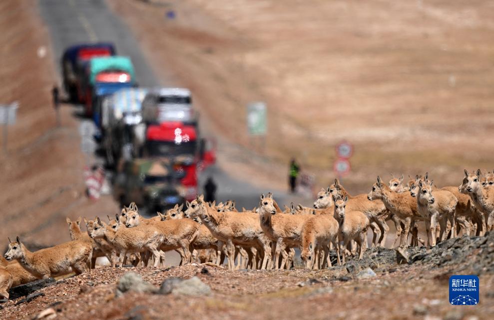 一群待產雌性藏羚羊正在通過青藏公路前往可可西里卓乃湖產仔(5月29日攝)。
