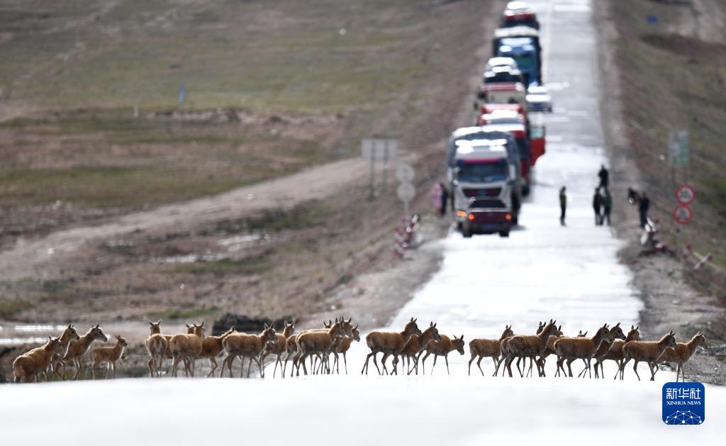 一群藏羚羊通過青藏公路前往青海三江源地區(7月28日攝)。