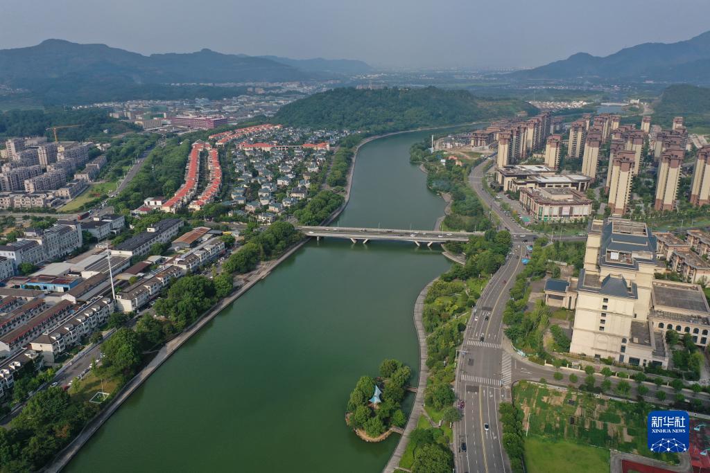 鳥瞰流經寧波市奉化區溪口鎮的剡江(8月11日無人機照片)。