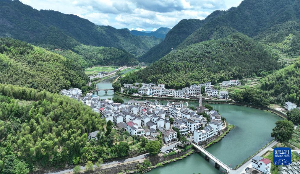 綠水青山環抱的杭州淳安下姜村(7月3日攝,無人機照片)。