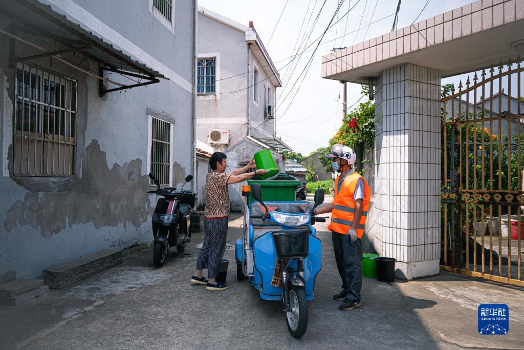 寧波市江北區外漕村村民(左)進行垃圾分類投放(8月11日攝)。
