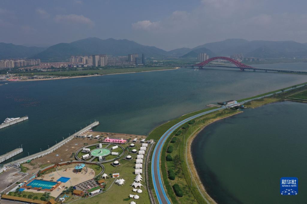 鳥瞰梅山灣沙灘公園(8月9日攝,無人機照片)。寧波市北侖區通過“陸海統籌、河海兼顧、上下聯動、智慧藍碳”治理新模式,累計投入21億元,使曾經“海水常年混濁,泥路和荒灘遍布”的梅山灣變為一片藍色海灣,用“金山銀山”反哺“綠水青山”。