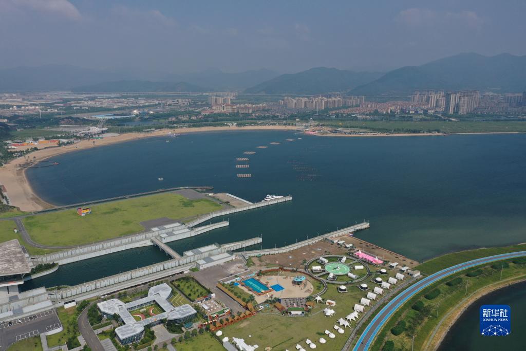 鳥瞰梅山灣沙灘公園(8月9日攝,無人機照片)。寧波市北侖區通過“陸海統籌、河海兼顧、上下聯動、智慧藍碳”治理新模式,累計投入21億元,使曾經“海水常年混濁,泥路和荒灘遍布”的梅山灣變為一片藍色海灣,用“金山銀山”反哺“綠水青山”。