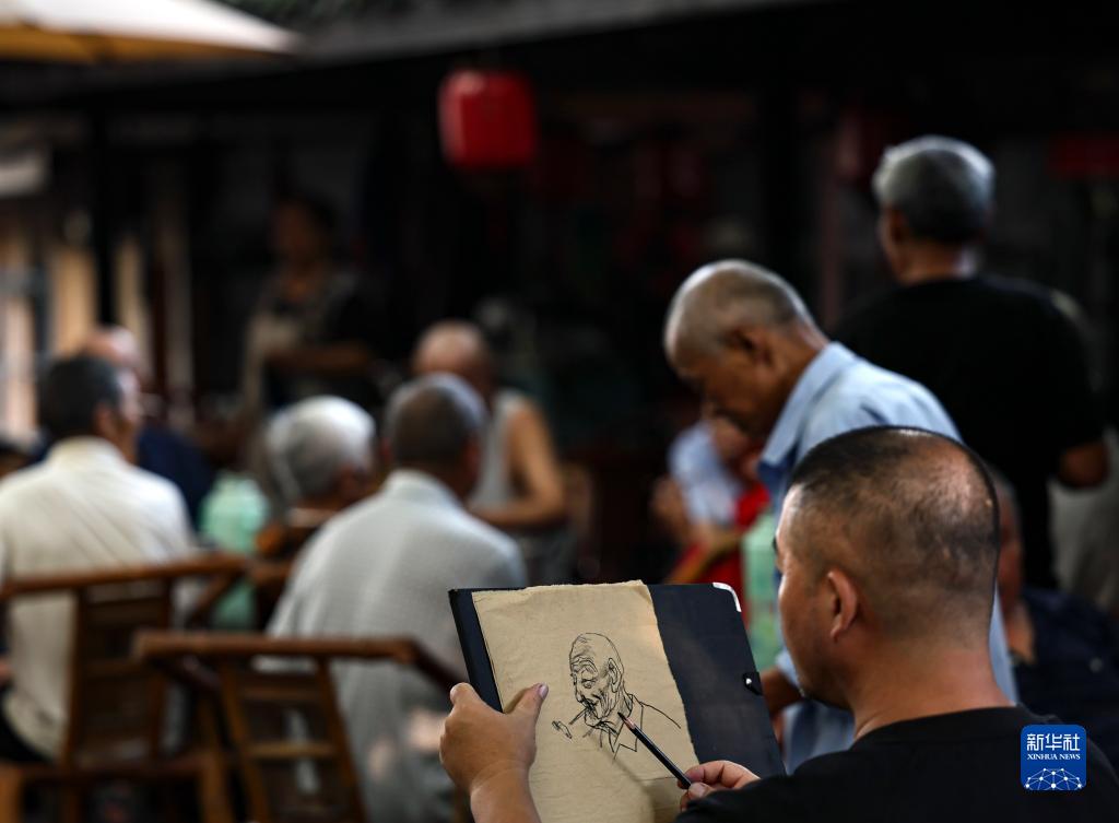 一位畫家為喝茶休閑的老人畫像(8月7日攝)。