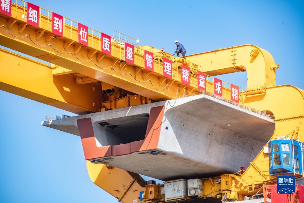 8月15日,在中鐵十一局集團承建的渝湘高鐵重慶段建設現場,隨著作業人員將首榀重790.25噸的大型箱梁精準架設在箭桿灣雙線特大橋19號至20號橋墩上,標志著渝湘高鐵重慶段箱梁架設全面展開。 渝湘高鐵重慶至黔江段是國家中長期鐵路網規劃“八縱八橫”中廈渝通道的重要組成部分,從重慶站引出,途經渝中、南岸、巴南、南川、武隆、彭水等區縣,止于重慶市黔江區,正線全長269.521公里,設計時速350公里。據悉,渝黔鐵路建成通車后,與黔常鐵路、渝廈高鐵常德至長沙段連接,成為成渝城市群、長江中游城市群、海西城市群間高速客運交流的通道,將有效填補渝東南武陵山區城鎮群沒有高鐵的空白,與重慶主城區實現1小時通達,成渝地區雙城經濟圈與長江中游城市群、海峽西岸城市群的快捷通道全面打通,對拉動投資、發展產業、帶動就業、助推鄉村振興、助推西部地區發展具有重大意義。