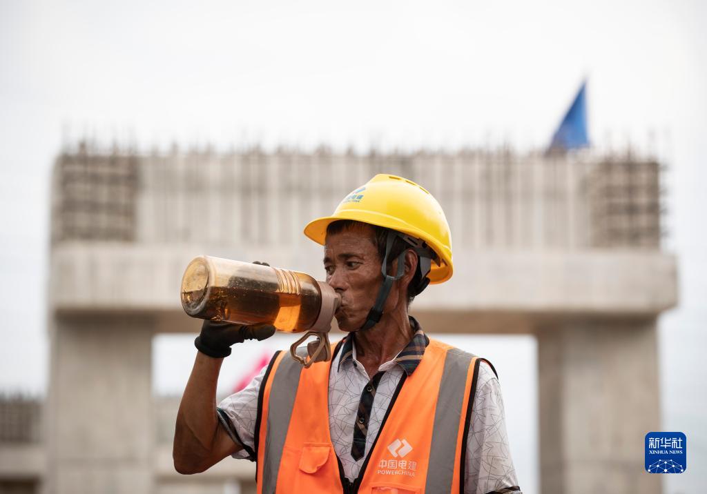 8月14日,建設人員在以色列特拉維夫輕軌綠線G3-4標段工程施工現場作業的間隙喝水。