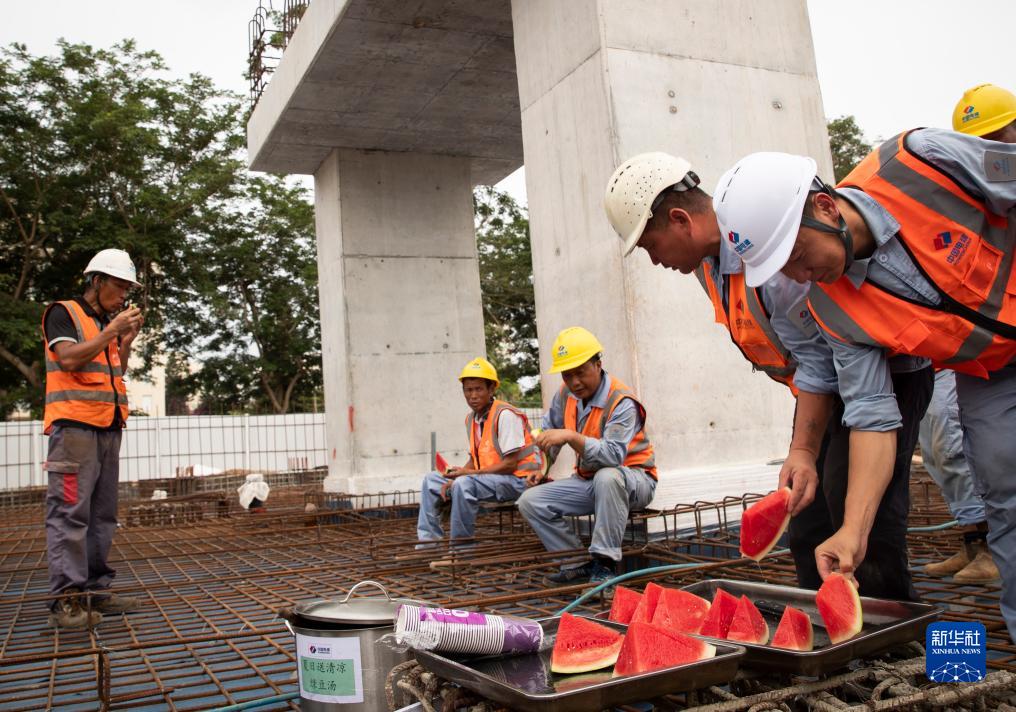 8月14日,建設人員在以色列特拉維夫輕軌綠線G3-4標段工程施工現場作業的間隙吃西瓜。