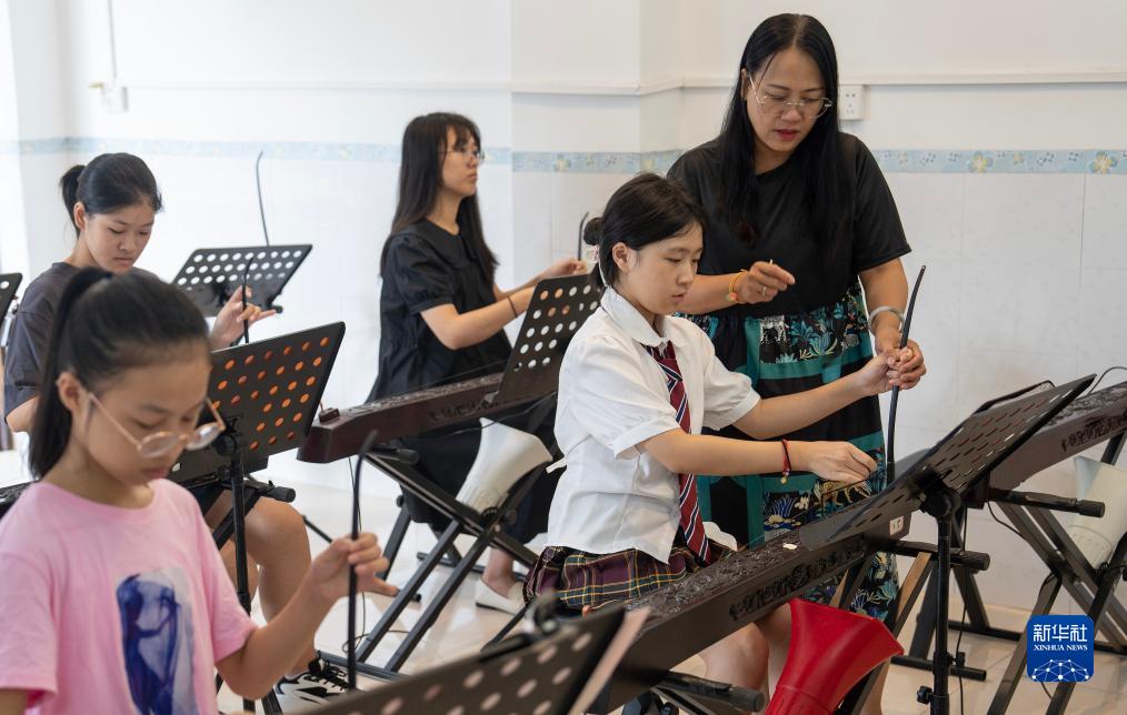 8月13日,東興京族博物館館長、獨弦琴傳承人蘇海珍(右一)在指導學生練習。