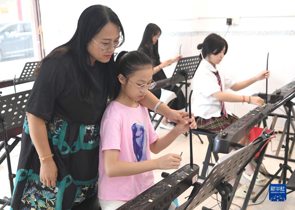 8月13日,東興京族博物館館長、獨弦琴傳承人蘇海珍在指導學生練習。