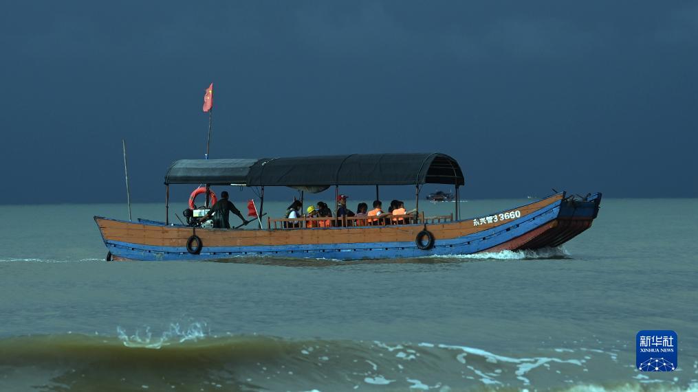 8月15日,游客搶在雷雨來臨前乘船返程。