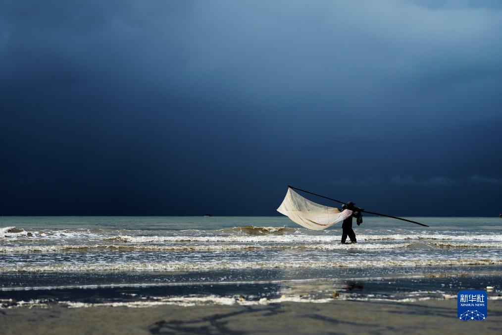 清晨,迅速變化的光線和云彩、來來往往的游客、聞雞起舞的漁人以及奔騰不息的波浪,在廣西東興的金灘上一起奏響了一首美妙的樂曲。