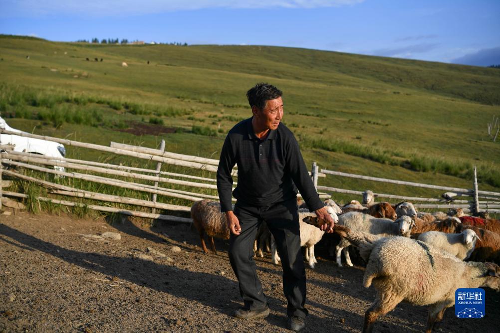 在新疆昌吉市廟爾溝鄉索爾巴斯陶牧場上,一名牧民在羊圈內抓羊,準備出售(8月13日攝)。