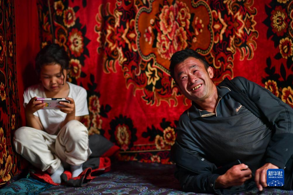 在新疆昌吉市廟爾溝鄉索爾巴斯陶牧場上,牧民木合塔爾(右)和女兒在房間內休息(8月14日攝)。