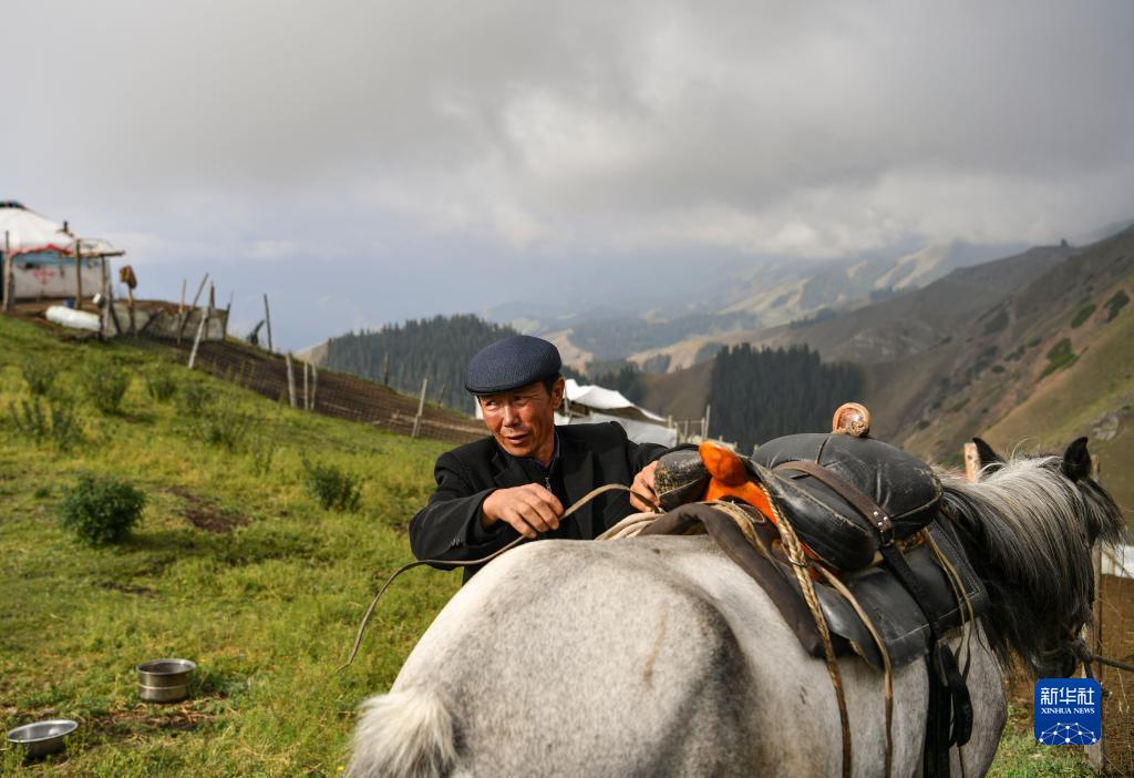 在新疆昌吉市廟爾溝鄉索爾巴斯陶牧場上,一名牧民整理鞍具,準備外出放牧(8月14日攝)。
