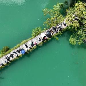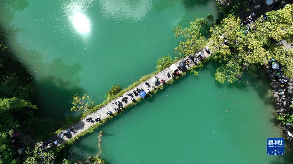 8月15日,游客在貴州省荔波小七孔風景區游玩(無人機照片)。