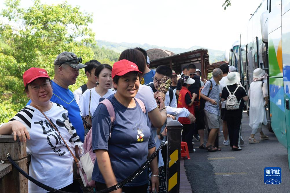 8月15日,游客在貴州省荔波小七孔風景區有序等候乘車。