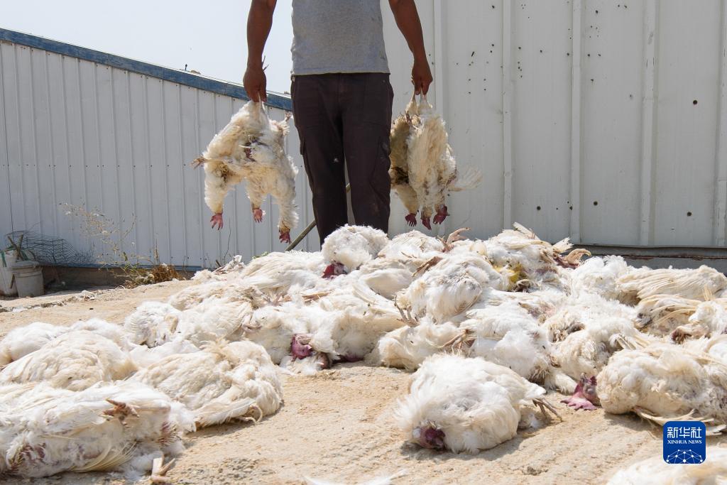 這是8月14日在以色列北部馬爾加利奧特村一養雞場拍攝的因高溫死亡的雞。