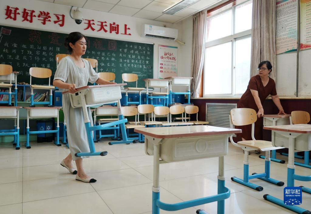 8月14日,北京市門頭溝區妙峰山民族學校的工作人員在布置教室。