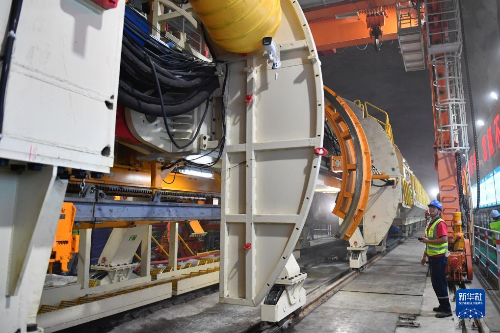 8月15日,在湖南平江抽水蓄能電站引水隧洞建設現場,工作人員查看“天岳號”掘進機作業情況。