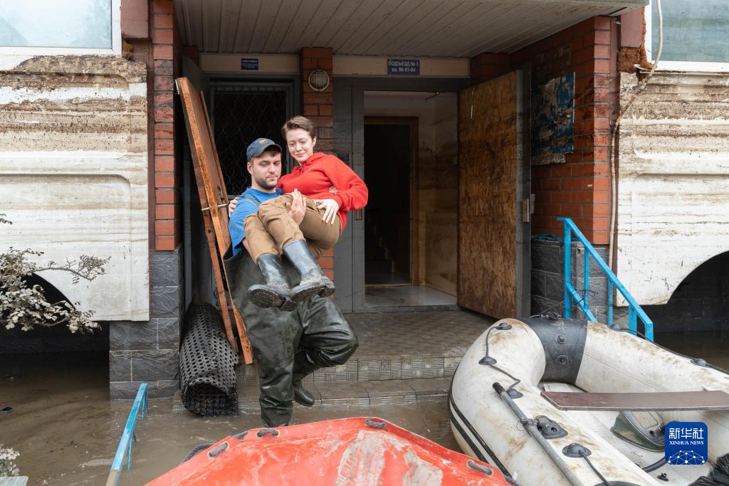 8月15日,在俄羅斯烏蘇里斯克市,救援人員幫助一名婦女出行。