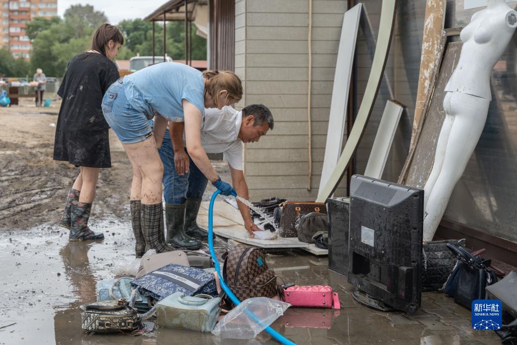 8月15日,在俄羅斯烏蘇里斯克市,人們清洗被洪水浸泡過的物品。