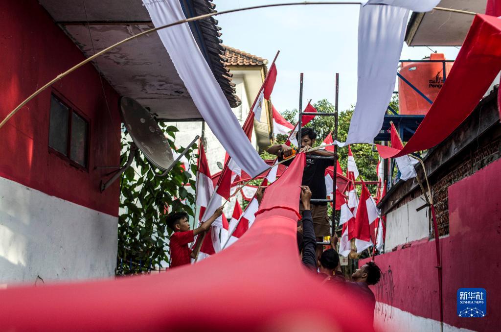 8月14日,在印度尼西亞萬隆,人們在居民區布置印尼國旗元素裝飾。
