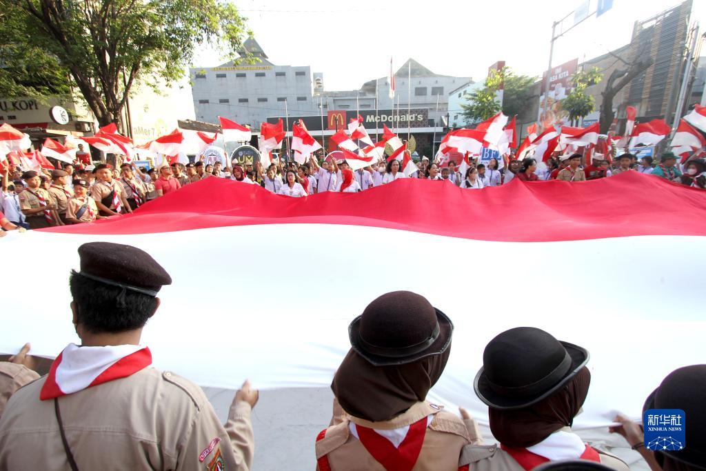 8月13日,在印度尼西亞梭羅,學生們在街頭舉著巨幅印尼國旗迎接獨立日。