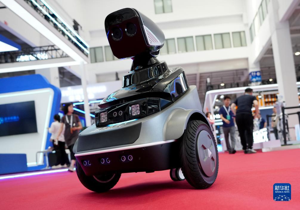 8月16日,在2023世界機器人大會現場,具有防火防盜功能的巡邏機器人在執勤。