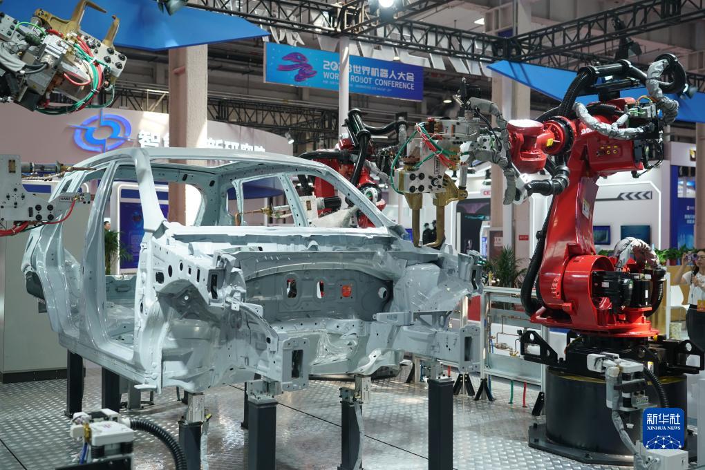 8月16日在2023世界機器人大會現場拍攝的白車身焊點機器人工作站。
