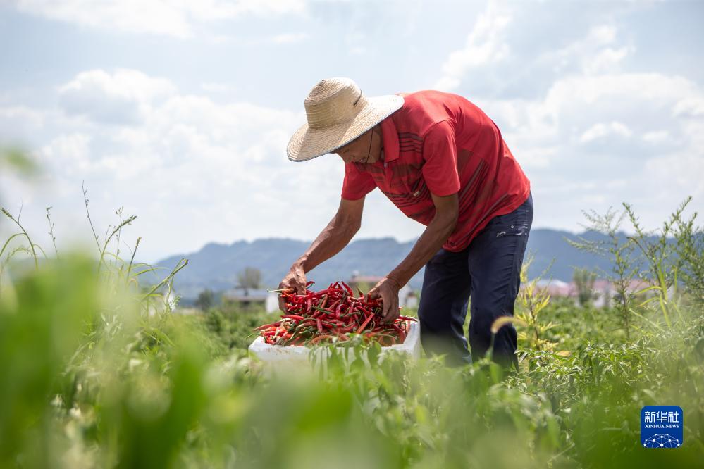 8月15日,村民在重慶市石柱土家族自治縣龍沙鎮長坪村辣椒種植基地收獲辣椒。