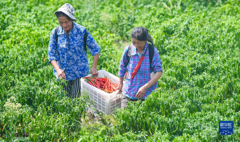 8月15日,村民在重慶市石柱土家族自治縣龍沙鎮長坪村辣椒種植基地抬運采摘的辣椒。