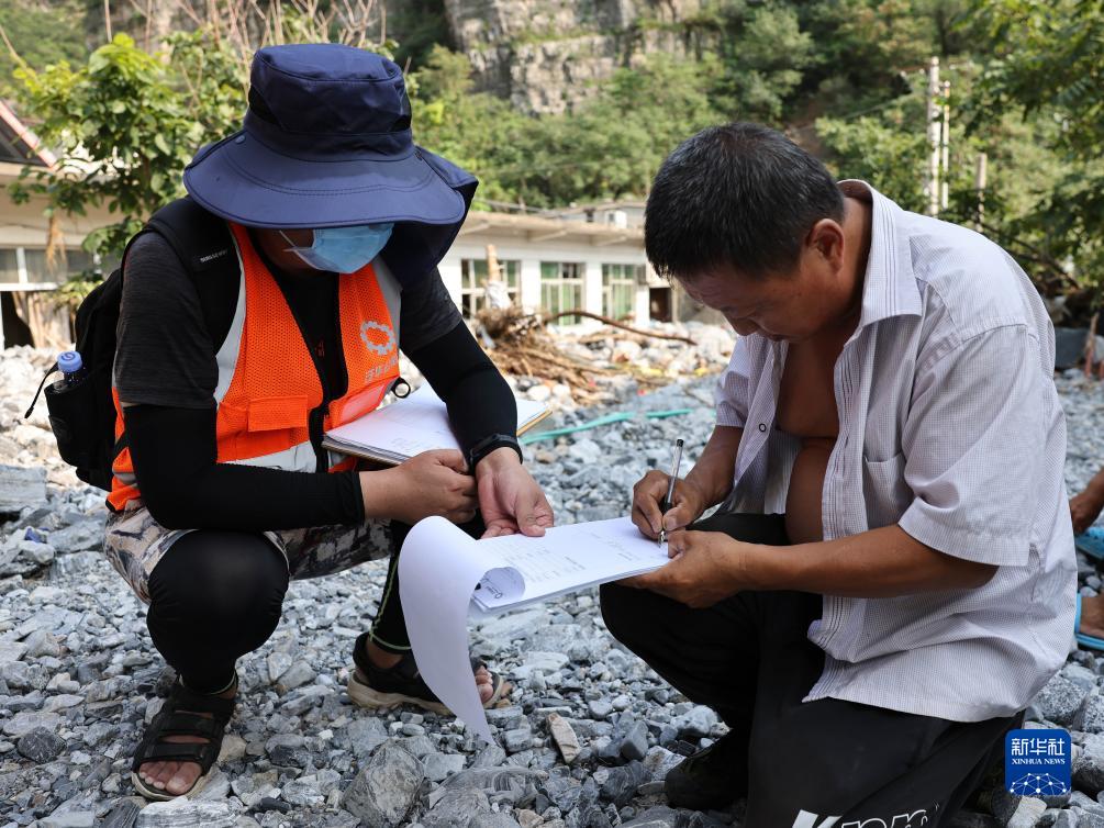 8月15日,保險評估公司工作人員(左)在河北淶水縣三坡鎮都衙村四背峪村民小組登記評估村民災后損失情況。
