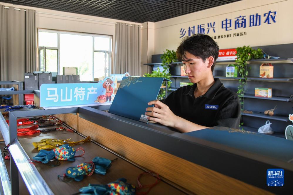 8月15日,工作人員在馬山鎮電商服務中心內整理貨品。
