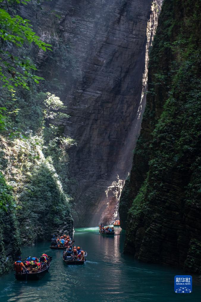 湖北省恩施土家族苗族自治州鶴峰縣森林覆蓋率高,空氣清新,氣候宜人。位于該縣容美鎮的屏山峽谷,全長約18公里,峰巒與河谷高差達千米,最窄處僅五尺,形成罕見的峽谷和地縫特色風光,碧水、輕舟與絕壁、森林相映成趣,每年吸引眾多海內外游客前來觀光。