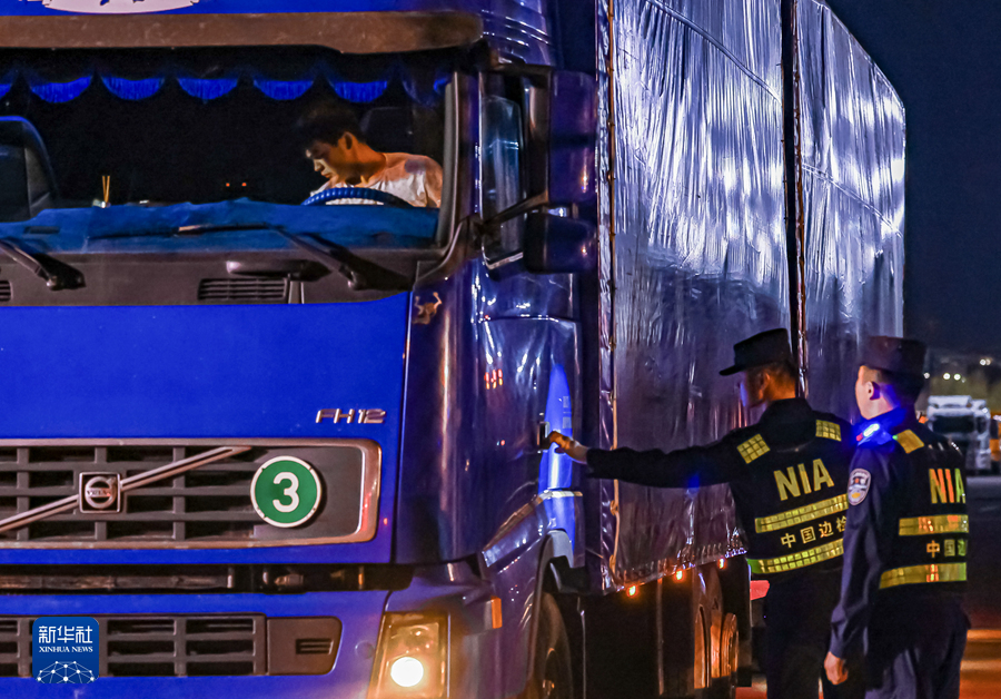 8月15日,霍爾果斯出入境邊防檢查站民警對出境車輛進行查驗。