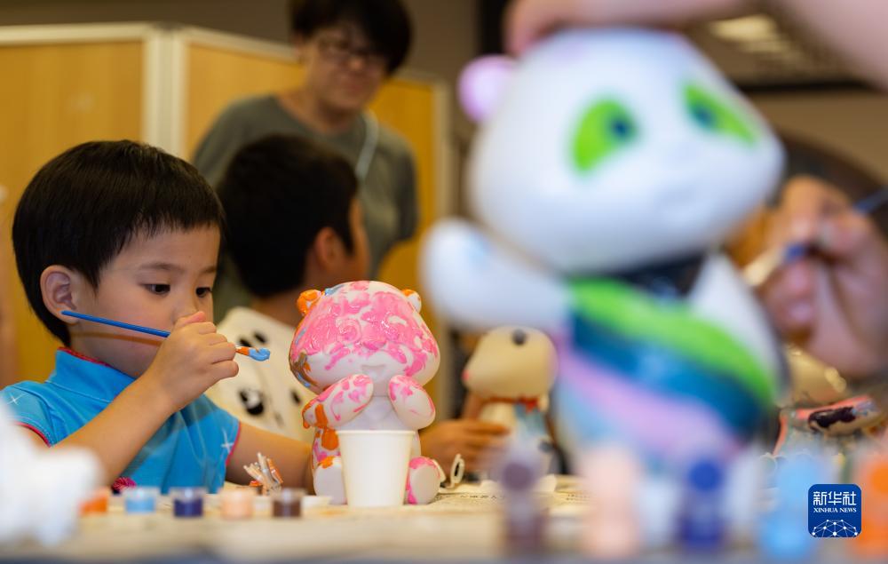 8月16日,在日本東京中國文化中心,人們制作屬于自己的彩色大熊貓玩偶。