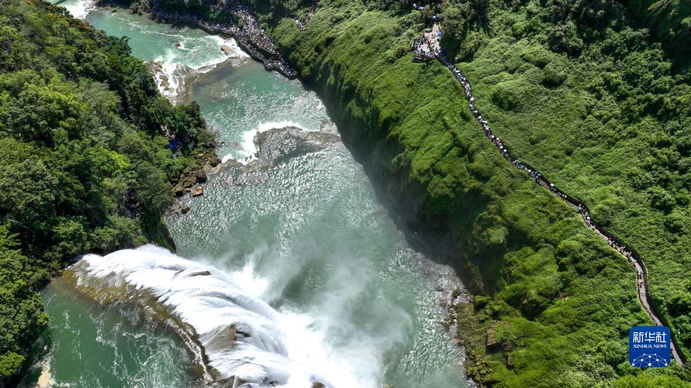8月16日,游客在貴州省安順市黃果樹瀑布景區游覽(無人機照片)。