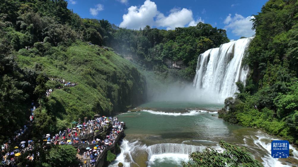 8月16日,貴州省安順市黃果樹瀑布景區游人如織(無人機照片)。