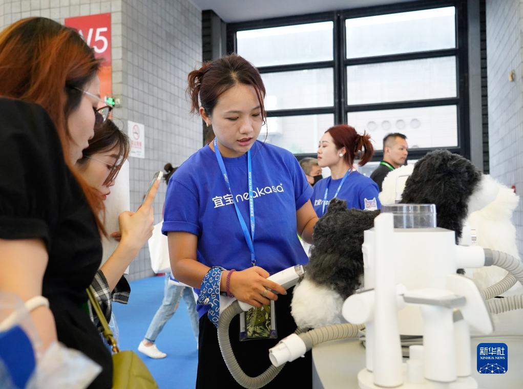 8月16日,在第25屆亞洲寵物展覽會上,參展商工作人員向觀眾演示寵物理毛器產品。