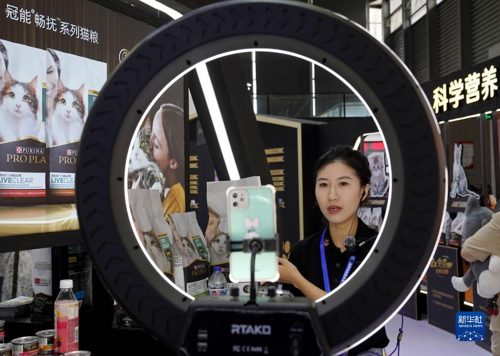 8月16日,在第25屆亞洲寵物展覽會寵物食品館,展臺人員在進行在線直播。