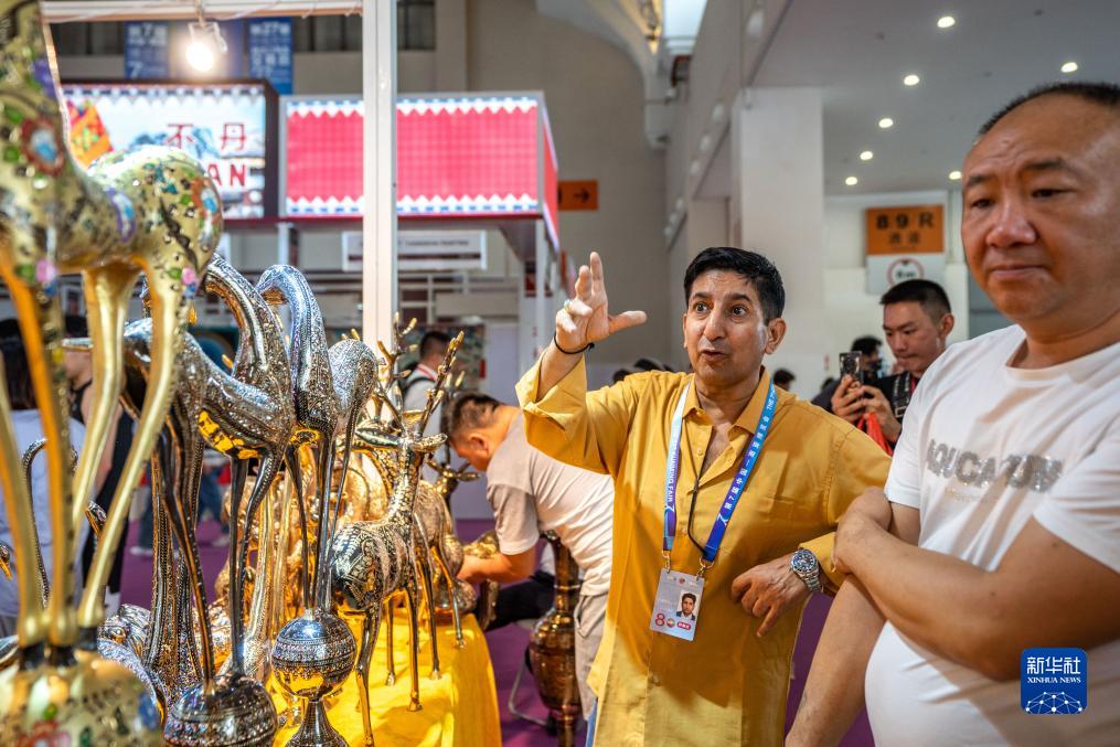 8月16日,參展商(左)在第七屆中國—南亞博覽會巴基斯坦展區推介特色商品?! ⌒氯A社記者 胡超 攝