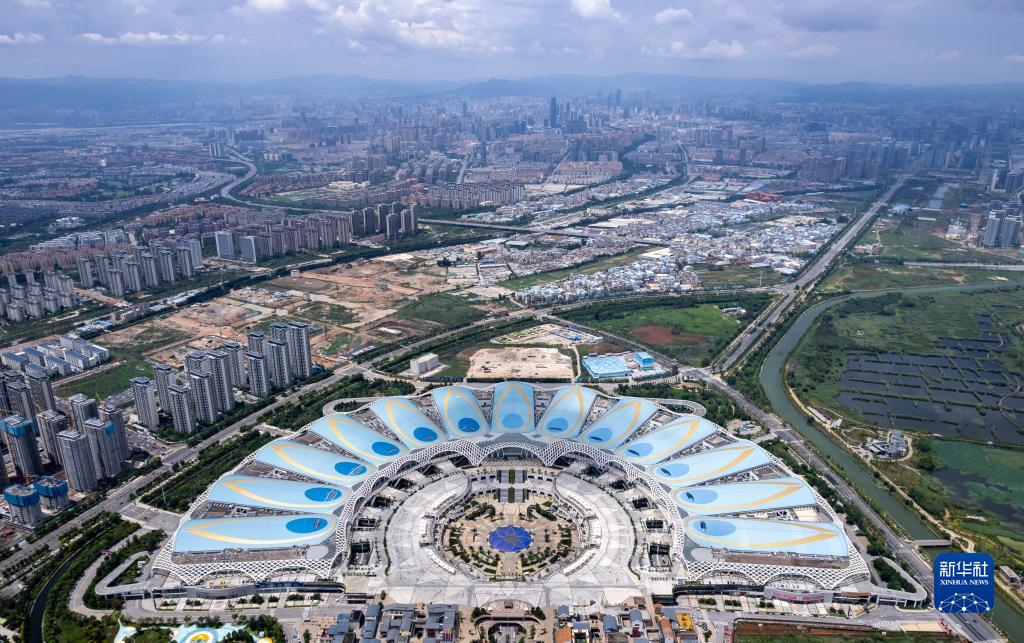 這是8月7日拍攝的第七屆中國—南亞博覽會舉辦地昆明滇池國際會展中心,遠處是昆明市區(無人機照片)?!⌒氯A社記者 陳欣波 攝