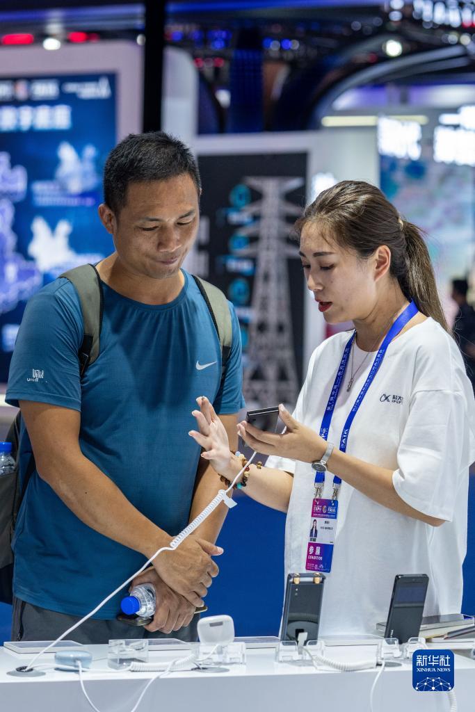 8月16日,來自廣東的客商(左)在第七屆中國—南亞博覽會科大訊飛展位了解翻譯設備?! ⌒氯A社記者 胡超 攝