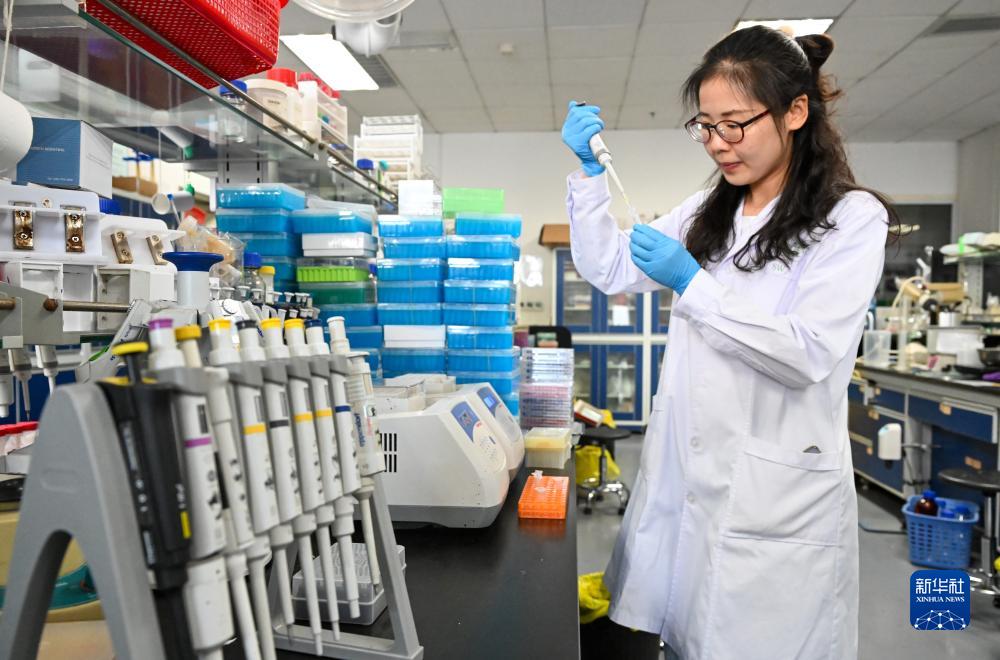 在中國科學院天津工業生物技術研究所實驗室,宋皖博士在做人工合成己糖實驗(8月13日攝)。