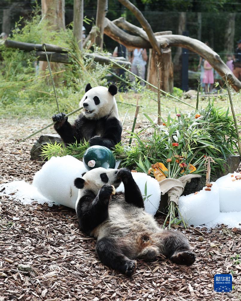 8月16日,在比利時布呂熱萊特的天堂動物園,大熊貓“寶弟”(上)、“寶妹”享用“生日大餐”。